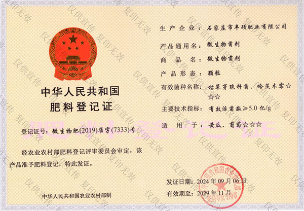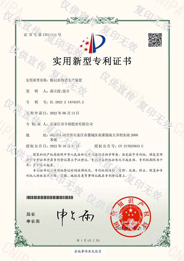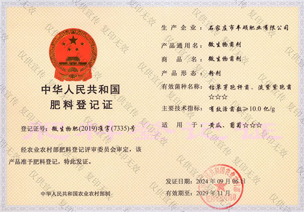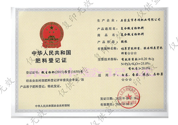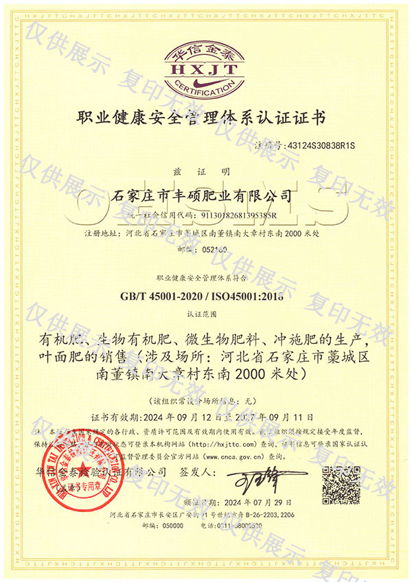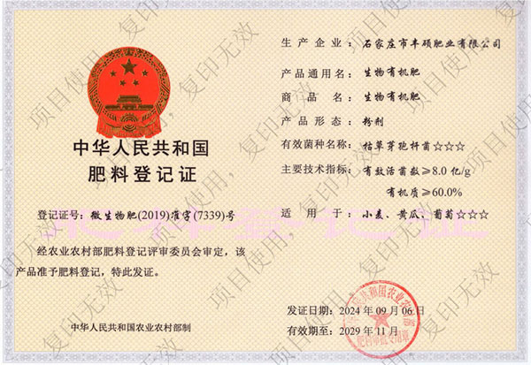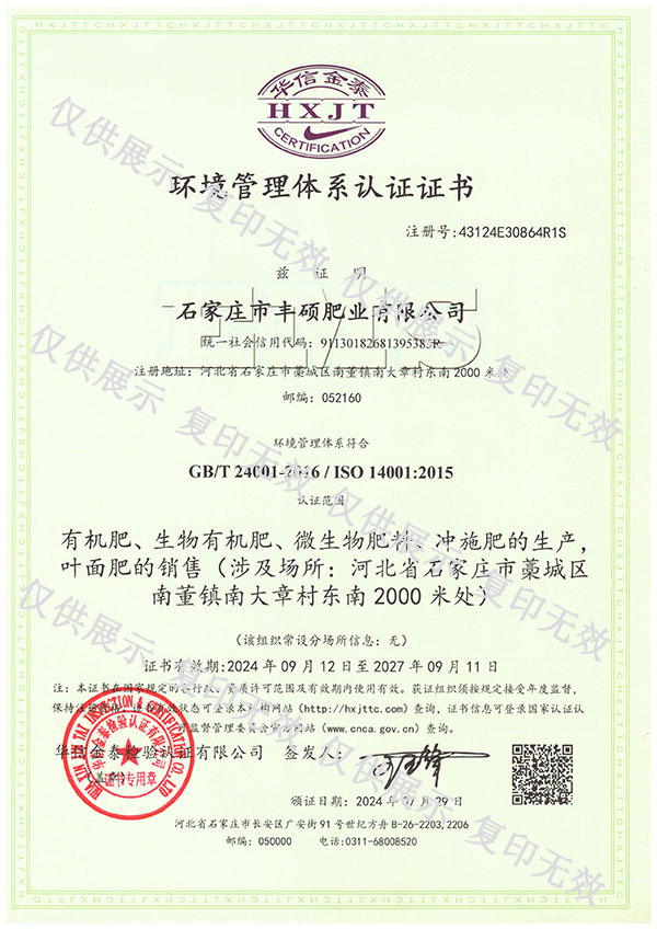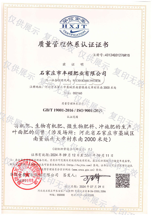 石家莊市豐碩肥業(yè)有限公司是一家集新型肥料的研發(fā)、制造、營銷、服務于一體的高新技術企業(yè),公司自2008年創(chuàng)辦以來,一直致力于新型肥料的技術研發(fā)和市場推廣。公司組建了豐碩新型肥料研究中心(院士專家企業(yè)工作站),自主知識產權研發(fā)團隊專業(yè)科研人員20余人,獲得了多項肥料國家發(fā)明專利。公司目前已擁有發(fā)酵類有機肥、微生物菌劑、生物有機肥、土壤調理劑、大量元素水溶肥、含腐植酸肥料、含氨基酸肥料、中微量元素肥料等8大品類,“金維克”、“豐碩沃農”等2大自有品牌,擁有20多個暢銷品種。目前,我公司已經(jīng)通過了“ISO9001 質量管理體系認證”、“ISO14001 環(huán)境管理體系認證”、“OHSAS18001 職業(yè)健康管理體系認證”。...